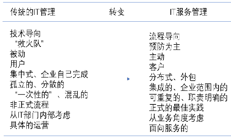 根本出發(fā)點在于通過 IT 服務有力的支持企業(yè)的發(fā)展以及業(yè)務部門業(yè)務的開展,促進企業(yè)競爭力的有效提升。在 IT 管理當中,IT 服務管理屬于不可或缺的構成部分。但是IT 服務管理有別于傳統(tǒng)的 IT 管理,其存在的意義在于將基于服務之上的 IT 管理提供給購買 IT 服務的企業(yè)或內(nèi)部部門。