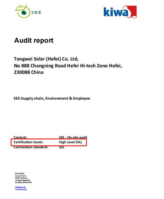 作為全球認(rèn)證領(lǐng)域20強企業(yè),Kiwa集團(tuán)專家與Kiwa BCC專家對企業(yè)進(jìn)行了現(xiàn)場審核、通過員工訪談,以及文件評審等工作,最終為通威太陽能頒發(fā)了首份依據(jù)SEE標(biāo)準(zhǔn)的ESG現(xiàn)場評估報告,并高度評價了通威太陽能在ESG管理方面的突出表現(xiàn)。報告涵蓋可持續(xù)的企業(yè)治理、供應(yīng)鏈管理、員工權(quán)益、環(huán)境管理四個部分,總計約50個主題,在全球范圍內(nèi)有著較高且廣泛的客戶接受度和權(quán)威公信力。
